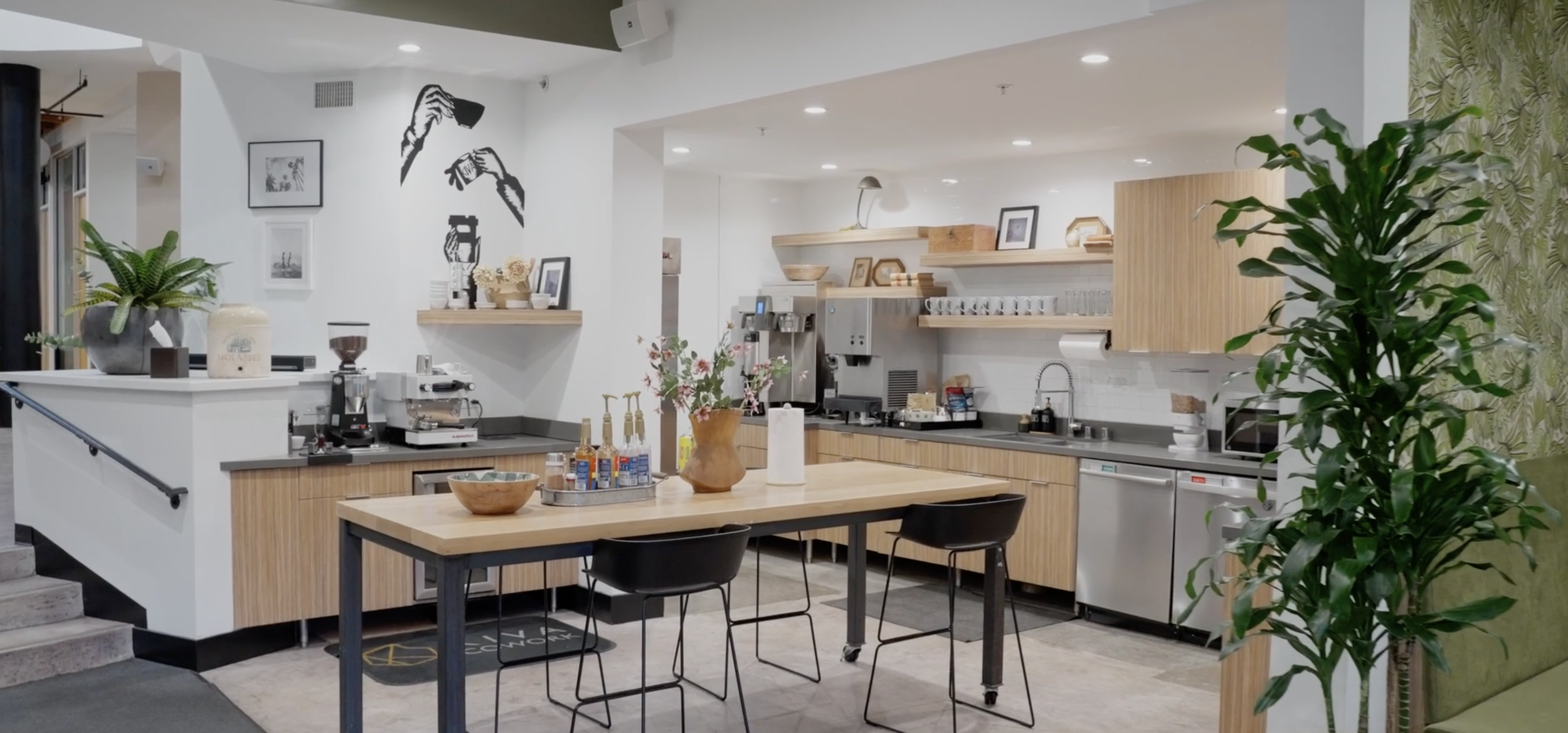 With a commercial sink, microwave, prep surfaces, and small appliances